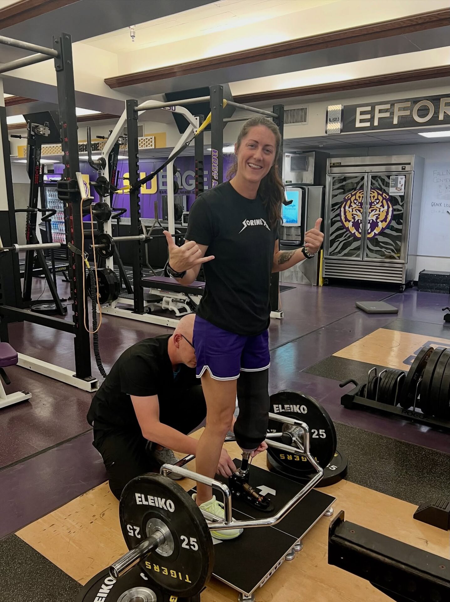 Steven cast and fit Katie’s first below-knee prosthesis, which she now uses for most daily activities. She has also since been fitted with a weightlifting prosthesis, which she uses while working out at the gym under Tiger Stadium. When needed, Steven even jumped in to help realign and adjust Katie’s prosthesis, making sure it stayed comfortable during her workouts.