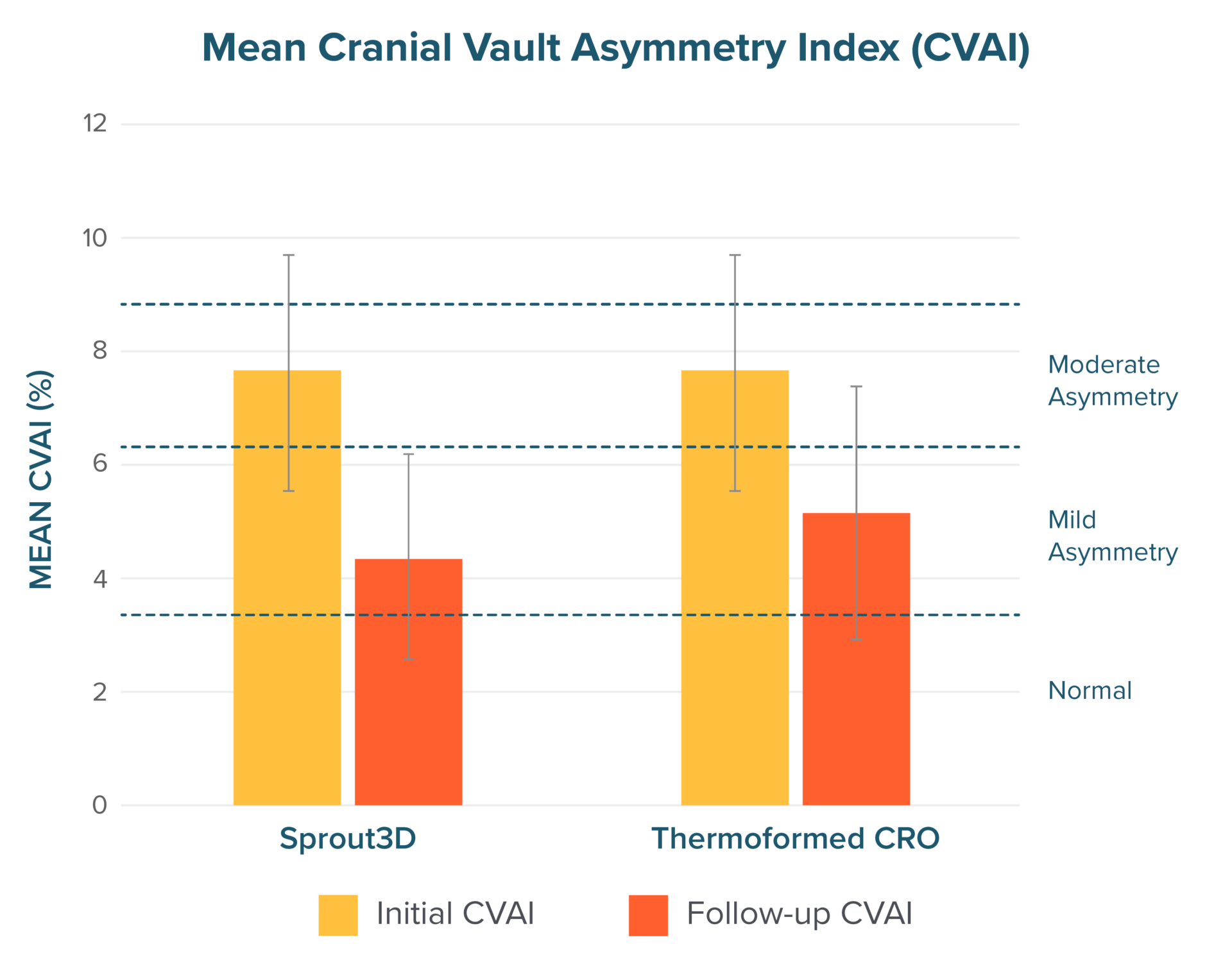 Infants treated with the 3D printed CRO demonstrated a reduction in CVAI from a mean of 7.67% at treatment initiation to 4.38% at follow-up, corresponding to a 42.9% improvement. Infants treated with traditional thermoformed CROs improved from 7.63% to 5.17%, representing a 32.9% improvement.