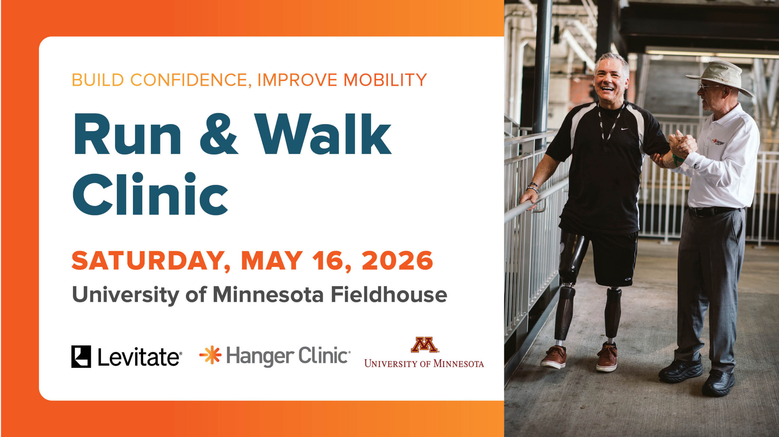 05/16/2026 09:00 AM 05/16/2026 01:00 PM America/Chicago Summer Run & Walk Clinic 2026 – The University of Minnesota Join Hanger Clinic at the The University of Minnesota Field House and to get ready for summer with our new Walking Clinic! Participants will have the opportunity to build confidence and improve mobility by navigating obstacles and walking on both turf and track surfaces in a supportive, guided environment. 1800 University Avenue SE, Minneapolis, MN 55455