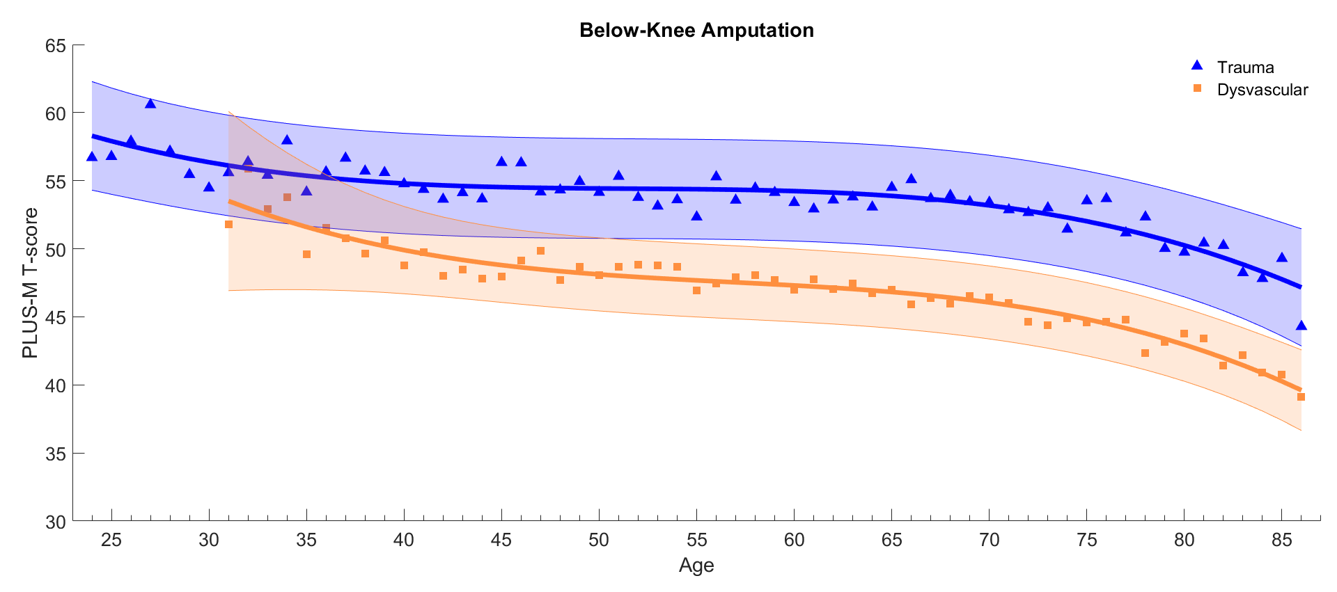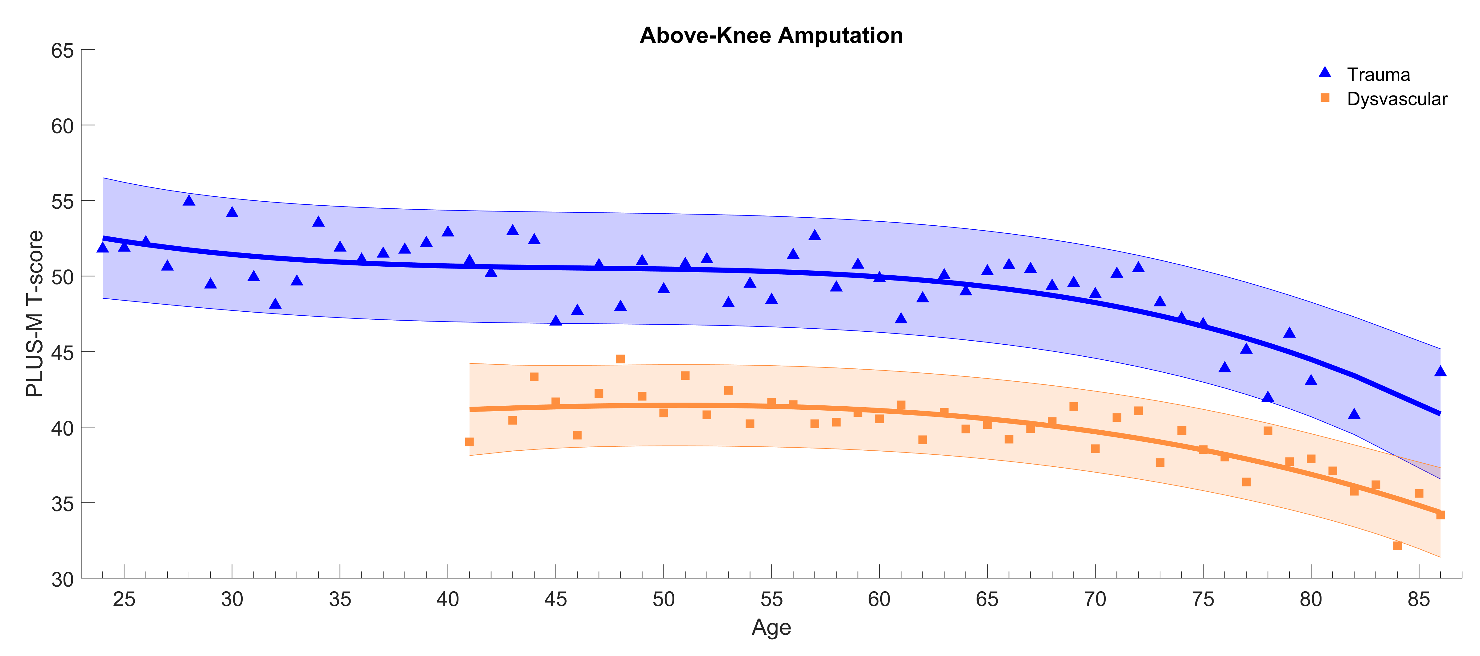 - To run this analysis, we used data from 29,522 unique patients. Each dot on the curves has the average of at least 15 patient’s scores. In instances where we had less than 15 patients, the data were excluded. The datapoints at 24 years of age include data from individuals 18-24 and the data at 86 includes individuals 86 and older. Some curves are shorter because there was not enough data to complete the curve across all age bins (e.g., under 40 years old for individuals with above-knee amputation due to dysvascular etiology)